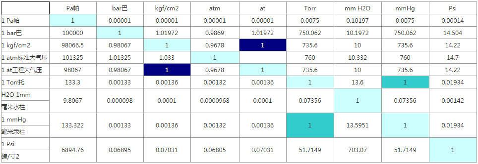 氣密性測試使用(yòng)過程中經(jīng)常用到的壓力單(dān)位換算表