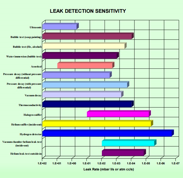 每個泄漏測試方法都有優點和缺點。對於泄漏包含在範圍10-1和10-3毫巴(bā)·升/秒的(de)泄漏,所有的氣密(mì)性(xìng)測(cè)試方法都能夠(gòu)識別泄漏。除了靈敏度,選擇適當的測(cè)試方法,必須考慮很多參(cān)數。其中有重複性,準確(què)性,報告能(néng)力,操作員的依賴性,最後,設備的成本(běn)和(hé)工作量。此外,示蹤氣體(tǐ)的成(chéng)本也很重要。